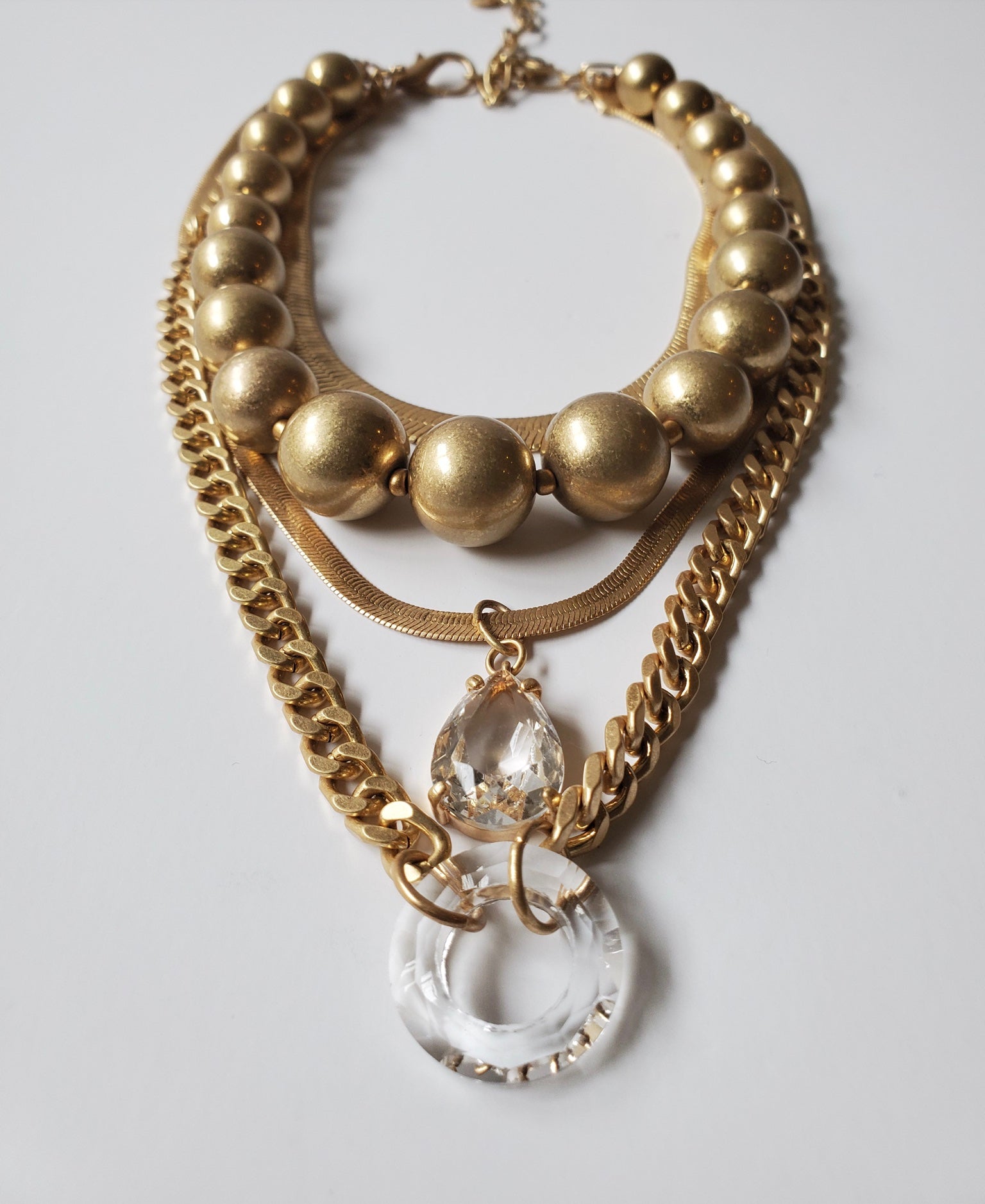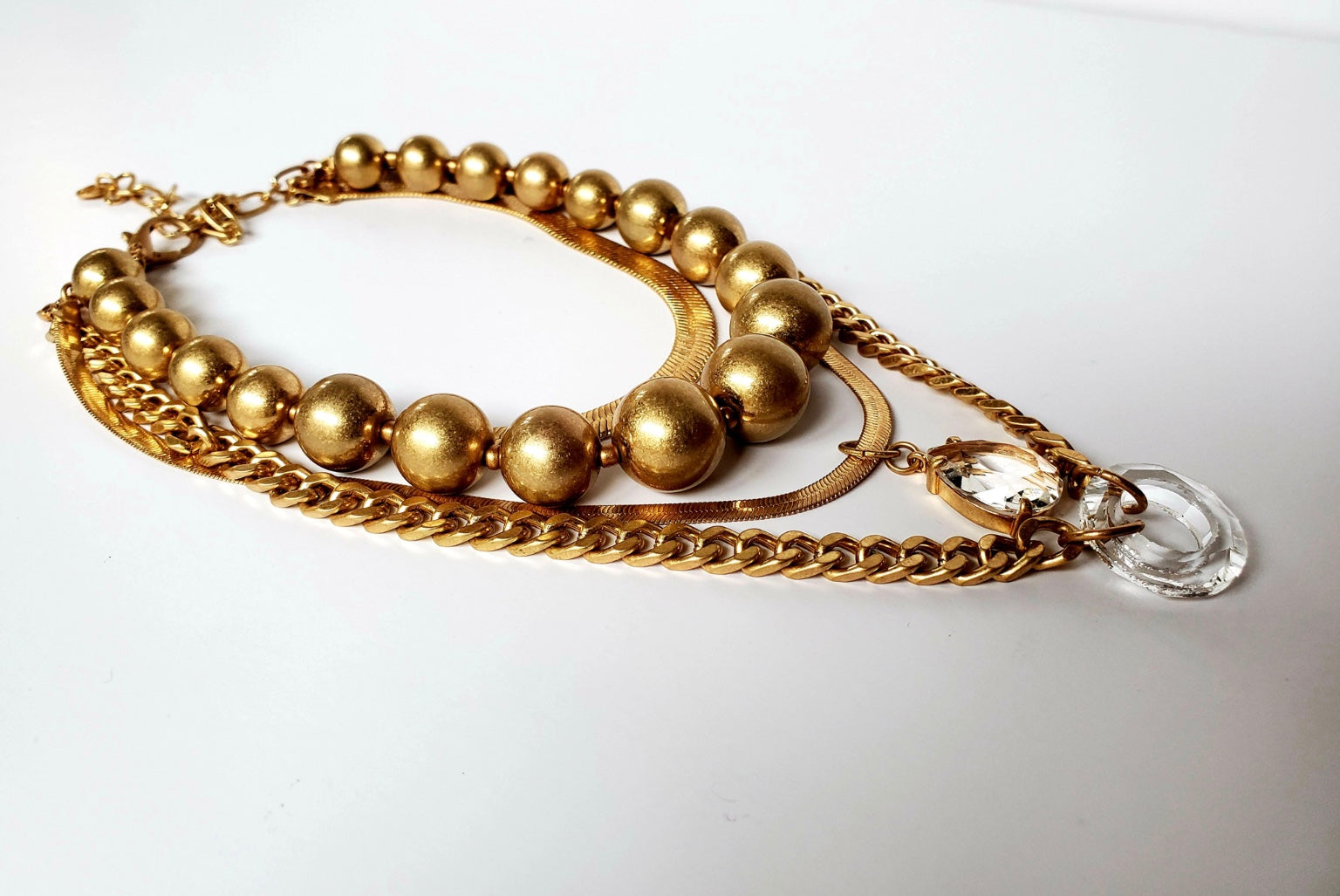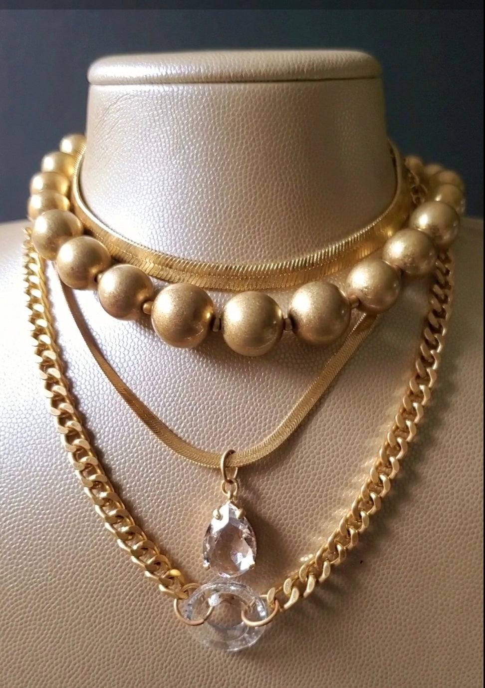 Layer on the style with a necklace set that keeps you on-trend! The necklace has four necklaces. One necklace features a snake chain design and the other necklace features a dainty layered design. The layered necklace features a strand of metallic matte balls, stone lucite pendent charm. Both necklaces include a lobster clasp closure. Complete look with a ruffled floral dress.